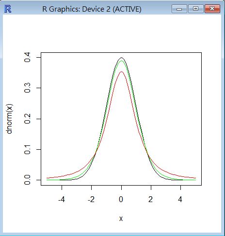 curve(dt(x, df=10), -5, 5, col="green", add=T)