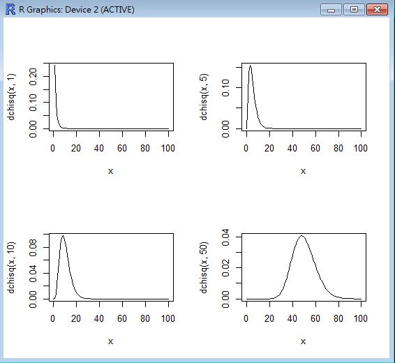 | 卡方分布 (Chi-Square) | $\frac{1}{2^{\gamma/2}\Gamma(\gamma/2)},x^{\gamma/2 - 1} e^{-x/2}$ | chisq(df, ncp) | 伽瑪分布( $b=2, a=\gamma/2$ ) 利用樣本推斷母體變異數 |