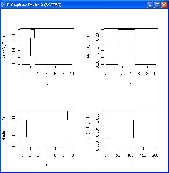 | 均勻分布 (Uniform) | $\frac{1}{b-a}$ | unif(a:min, b:max) | a:範圍下限, b: 上限 出現機會均等 |