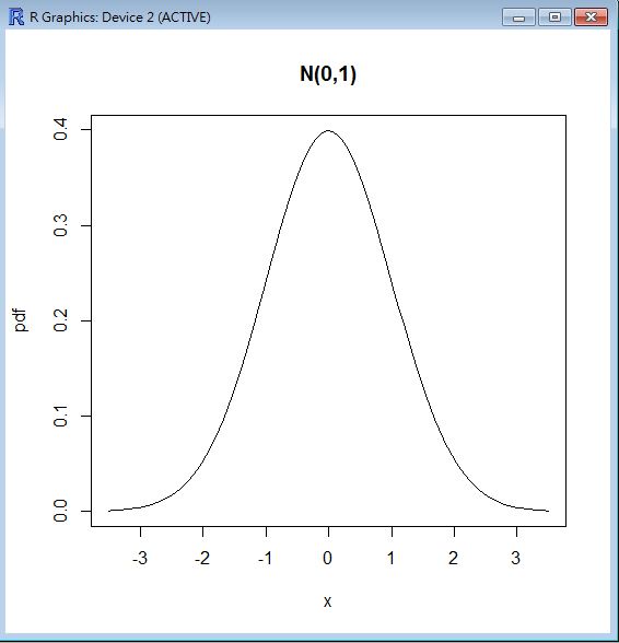 > curve(dnorm(x), from = -3.5, to = 3.5, ylab="pdf", main="N(0,1)")