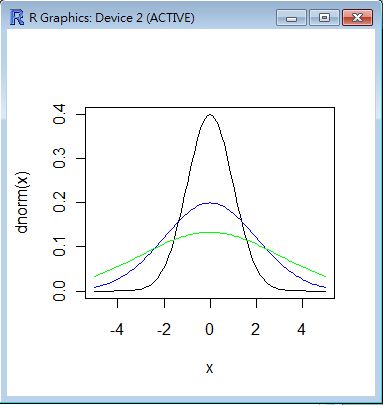 curve(dnorm(x, sd=3), -5, 5, col="green", add=T)