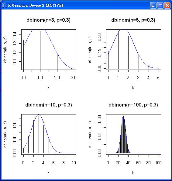 | 二項分布 | ${n \choose x} p^x (1-p)^{n-x}$ | binom(n:size, p:prob) | n:樣本數, p:正面機率, n 次試驗中有 x 個成功的機率 |