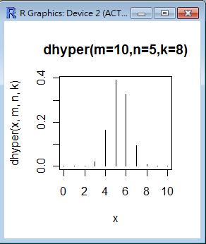 | 超幾何分布 | $\frac{ { r \choose x} {N-r \choose n-x} }{N \choose n}$ | hyper(N:m,n:n,r:k) | m:白球數量, n:黑球數量, k:抽出球數, 同二項分布,但取樣後不放回 |
