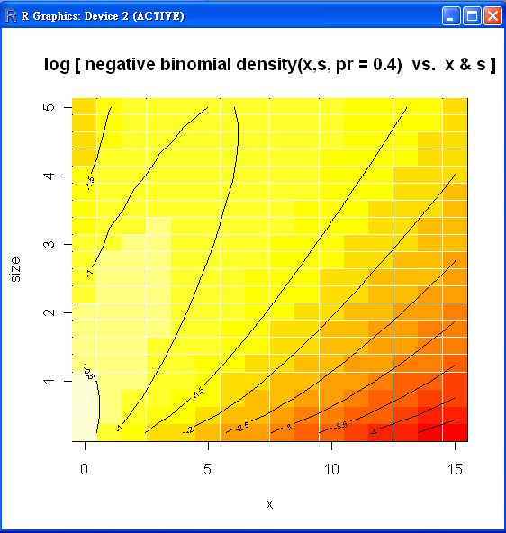 persp(x,size, dnb <- outer(x, size, function(x,s) dnbinom(x,s, prob= 0.4)),