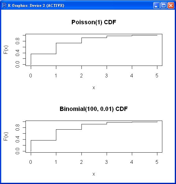 > plot(x, pbinom(x, 100, 0.01),type="s", ylab="F(x)",