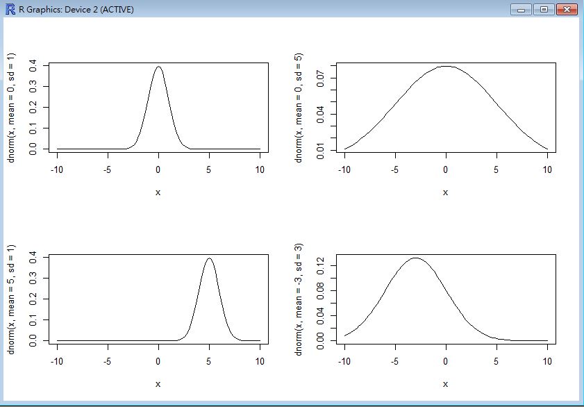 > curve(dnorm(x, mean=-3, sd=3), from=-10, to=10)