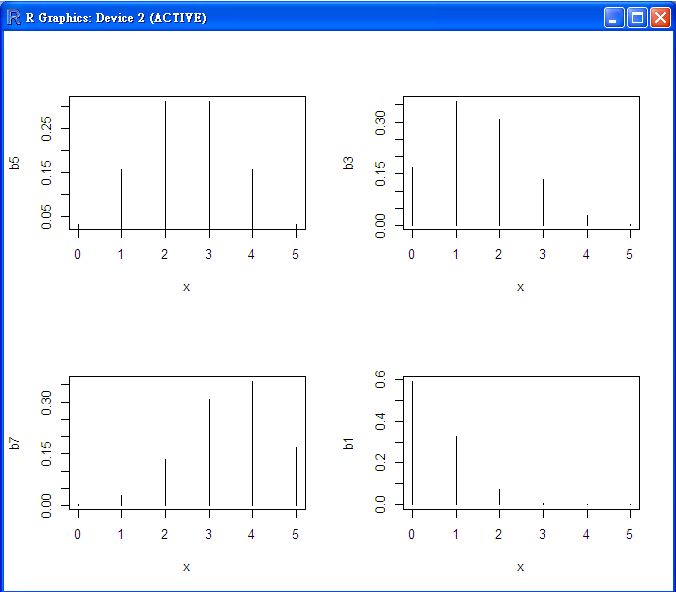 | 二項分布 | ${n \choose x} p^x (1-p)^{n-x}$ | binom(n:size, p:prob) | n:樣本數, p:正面機率, n 次試驗中有 x 個成功的機率 |