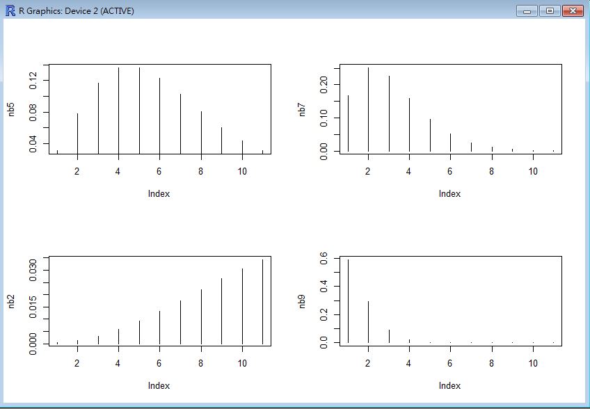 > dnbinom(0:10, 3, 0.5) # 失敗 10 次以下,成功 3 次,第 13 次前就成功 3 次。