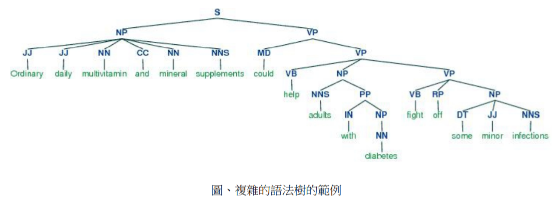 甚至,對於更複雜的句子,像是 『Ordinary daily multivitamin and mineral supplements could help adults with diabetes fight off some minor infections.』,也可能轉換成下列的剖析樹。
