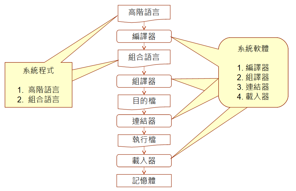 編譯器是將高階語言轉換為《組合語言或可執行檔》的工具,如運作流程下圖所示: