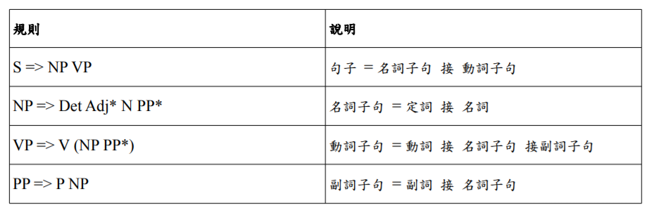 那麼透過 N => dog , V=> run 就可以產生 dog run 這樣的句子。