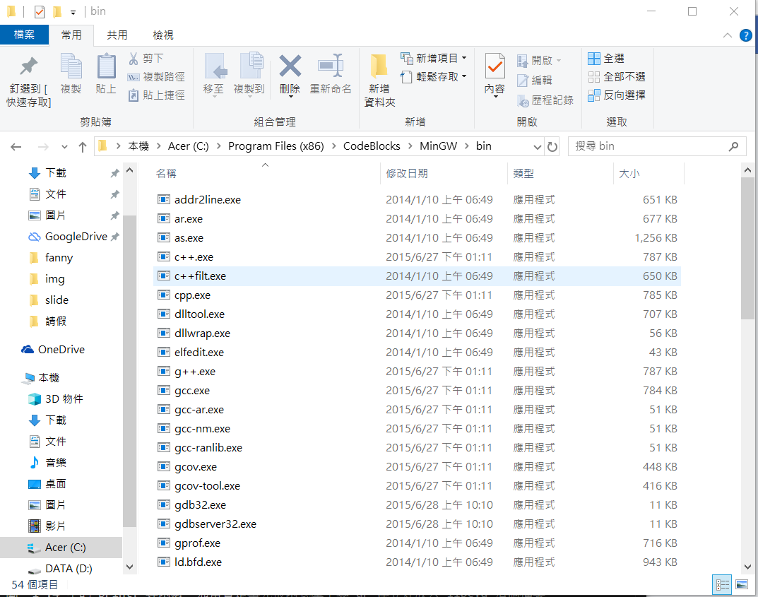 CodeBlocks 通常被安裝在《C:\Program Files (x86)\CodeBlocks\MinGW\bin》底下,如下圖所示: