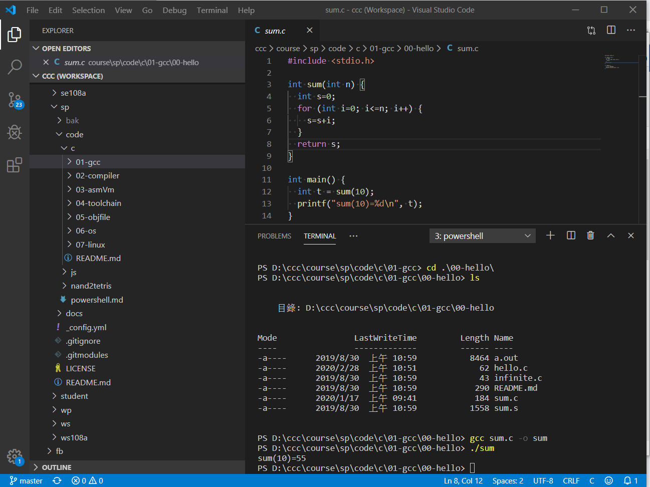 接著請打開 Visual Studio Code 開啟一個 Terminal,就可以開始使用 gcc 了。