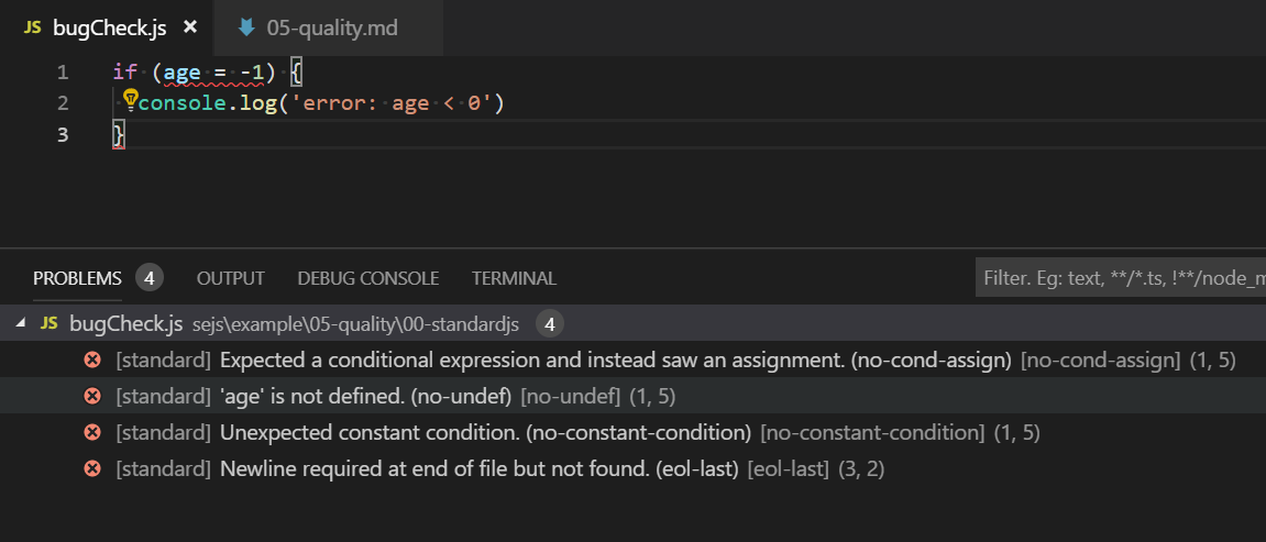 然後你可以在 Visual Studio Code 中安裝 StandardJs 的語法檢查器,就能在編輯的當下看到程式的問題。