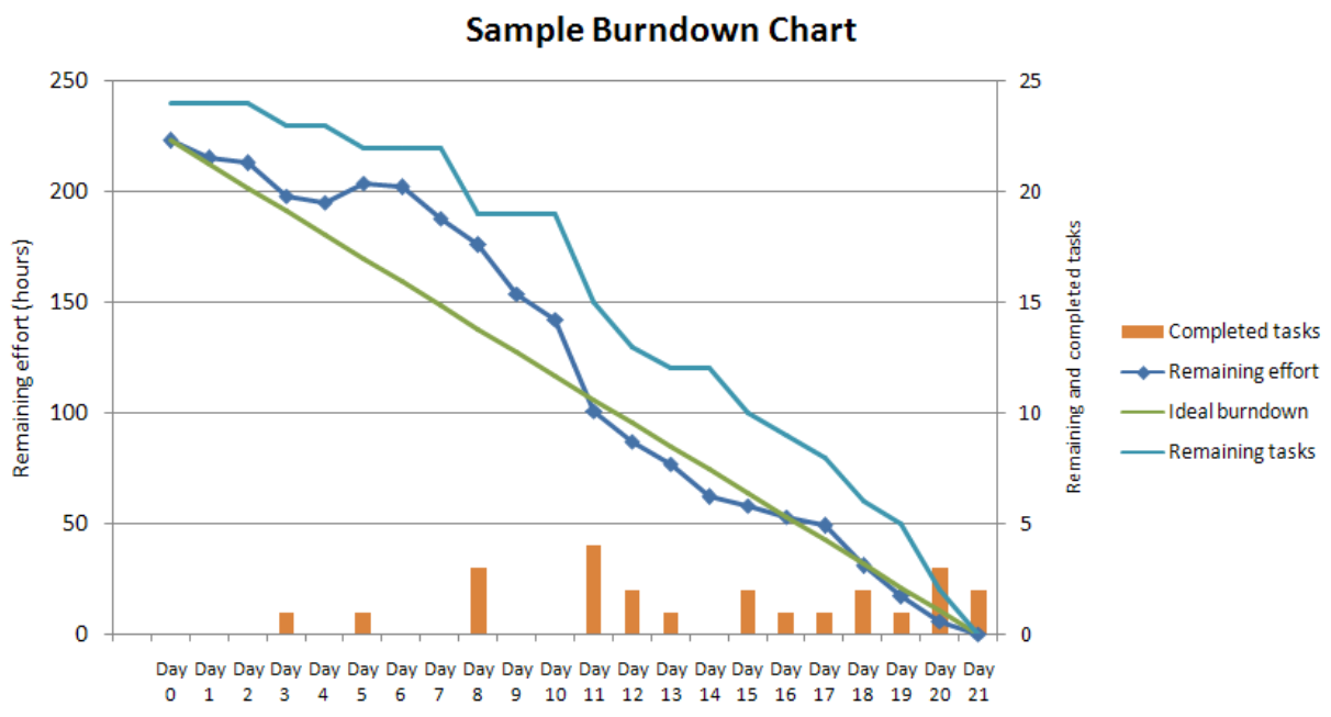 Scrum 建議用 Burndown Chart (燃盡圖) 來管控專案進度,規劃並掌握軟體開發時程,以下是體現了21天的進度的燃盡圖。