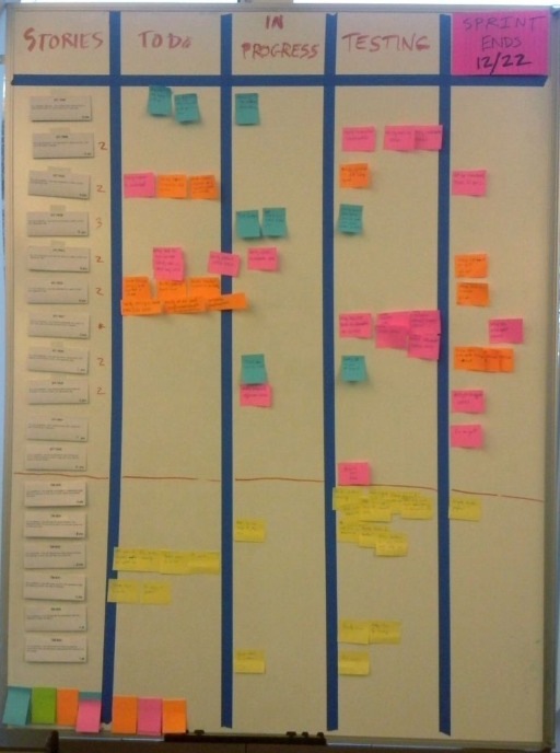 在實際運作的時候,很多敏捷方法 (包含 Scrum) 建議採用《看板+立可貼》的方式決定工作項目,如下圖所示: