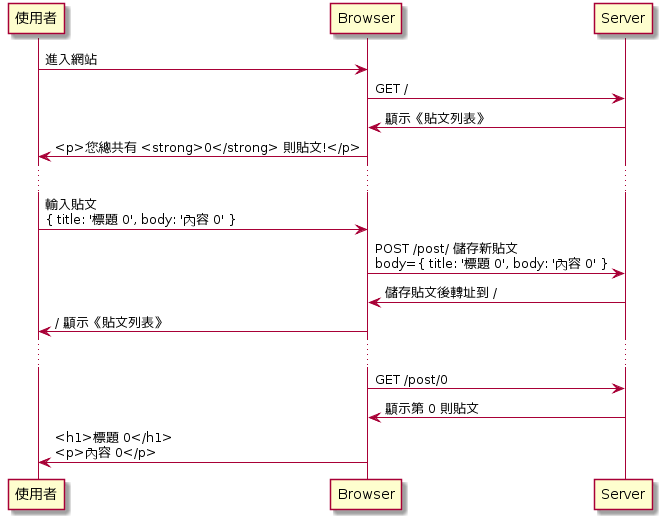 Browser -> Server : POST /post/ 儲存新貼文\nbody={ title: '標題 0', body: '內容 0' }