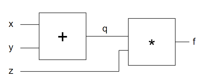 由於 f=q*z, q=x+y ,因此我們可以計算出下列算式:
