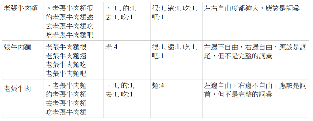 於是我們可以發現「牛肉麵、牛肉、牛肉麵節、張牛、老張牛肉麵、張牛肉麵」等字串的左右接情況分別如下。