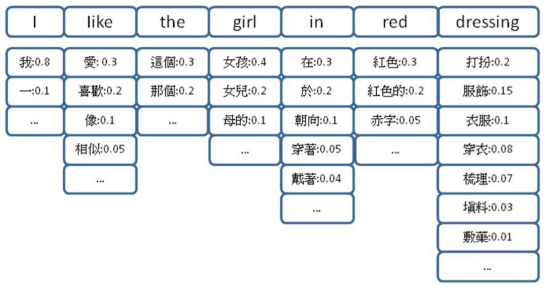 或許對許多讀者而言,上述的說明仍然太過抽象,讓我們以一個範例說明此種過程。假如我們希望將英文句子『I like the girl in red dressing』翻譯成中文,首先,透過字典,我們可以查出其中每一個英文詞彙的中文對照詞彙,例如 like 可能對應『愛、喜歡、像、相似』等詞彙,下圖顯示了該語句中每個 英文詞對應的候選中文詞的情況。